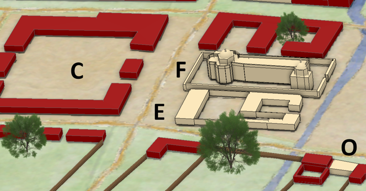 GLO staff used an oblique projection to create 3D polygons such as these buildings in the aerial view map. Notice the different shapes used to create San Fernando Church (F). A 3D model of the Alamo created by Pape-Dawson Engineers is featured in the upper right corner of the map. Details surrounding the Alamo include a pecan tree in the top left corner and abatis in the bottom right.