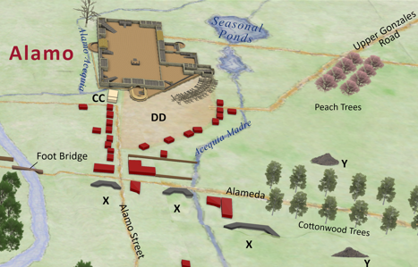 Containing an unprecedented level of detail for a GLO-produced GIS Educational Map, this is the largest scale – one inch to two hundred feet – used to this point. This facilitated an incredible amount of detail, including the Alamo’s artillery pieces, images of horses at the Potrero, and fencing and white oak trees known to the area. A dead tree in the northwest corner of the Alamo mimics a pecan tree during the winter. An abatis (defense made of felled trees) appears in the Alamo’s southeast corner. The map also locates batteries from the Texians’ Siege of Béxar and the Battle of the Alamo. The estimated sites of the Alamo funeral pyres appear on either side of the Alameda (cottonwood grove) roadway as reported by Béxar alcalde Francisco Antonio Ruiz. This thoroughly researched, intricate recreation of San Antonio de Béxar provides viewers a useful new tool to help understand the conditions surrounding the siege and fall of the Alamo.