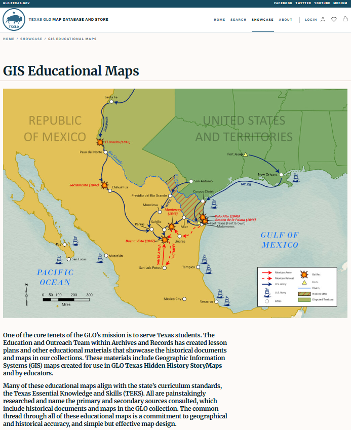 Over the last several years, the Texas General Land Office’s (GLO) Archives and Records Division has embarked on an ambitious project to use geographic information system (GIS) tools to create a series of GIS Educational Maps specifically suited for education and research. The aim has been to simplify imagery found on historic maps and to convey new or traditionally overlooked information in a way that is approachable for younger learners and seasoned Texas history enthusiasts alike.