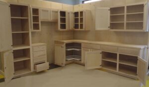 Students work as a team to read plans and build a set of custom kitchen cabinets, including base cabinets, upper cabinets and a separate pantry. They transport them to a building site (usually a building the Conventional Interior Finish class has completed), and install them.